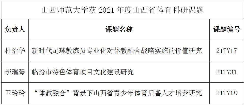 2021年6月23日山西省体育局下达了关于2021年度山西体育科研课题立项的通知,德赢杜治华、李瑞琴和卫玲玲老师获2021年度山西体育科研课题立项资助。获立项课题的信息如下:(院研究生部供稿)
