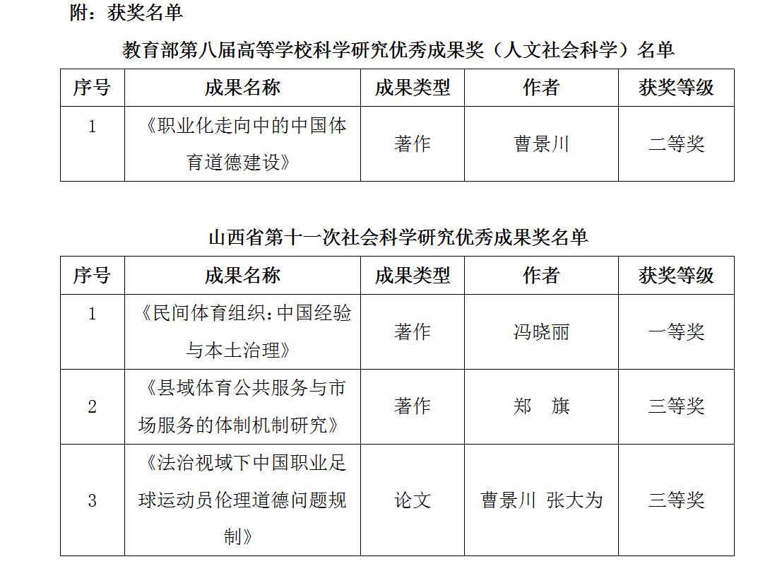 近日,教育部印发《关于第八届高等学校科学研究优秀成果奖(人文社会科学)奖励的决定》、山西省公布了山西省第十一次社会科学研究优秀成果获奖名单,德赢教师的多项著作、论文获奖,取得了新的突破。教育部高等学校科学研究优秀成果奖(人文社会科学),层次高、影响力大、权威性强,高校普遍将其视为哲学社会科学领域的最高奖项,山西省社会科学研究优秀成果获也是山西省该领域的最高奖项。德赢教师多项奖项获得,充分展现了学院近年来的学科建设水平和学科实力,希望广大教职工再接再厉,锐意进取,聚焦人文社会科学重大理论与实践问题,推动德赢学科建设与科研水平再上新台阶。(院办 文)