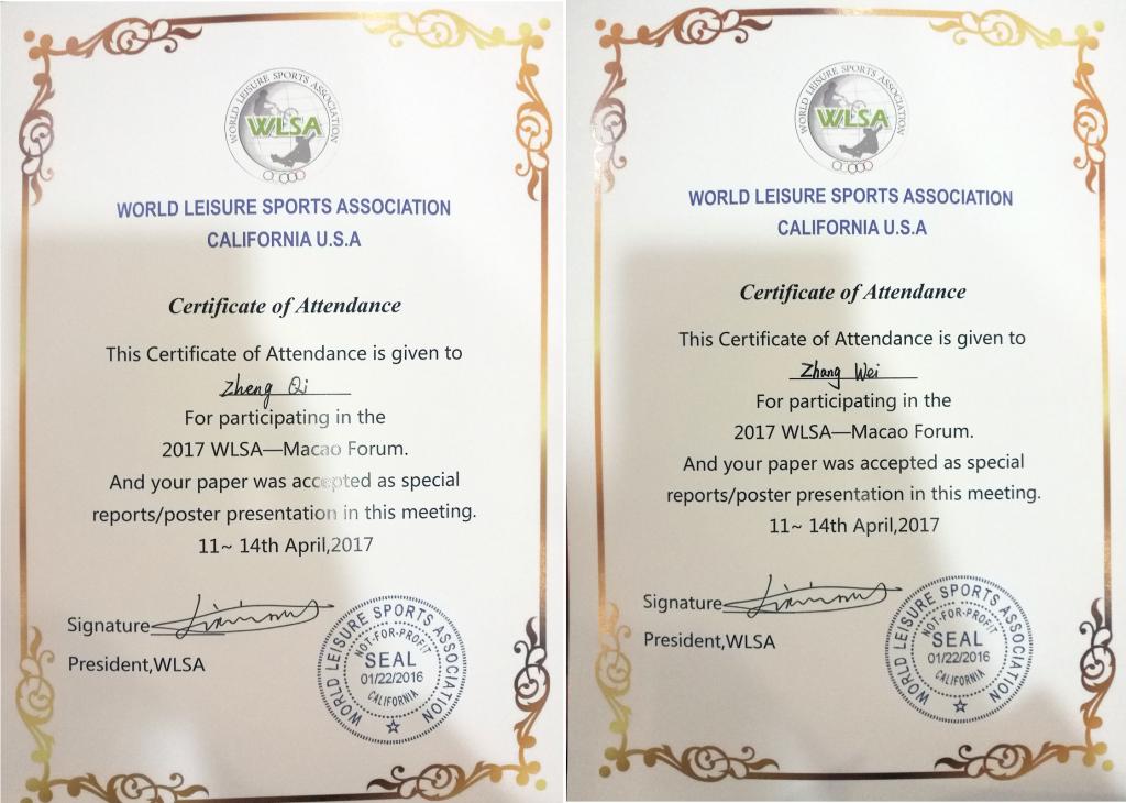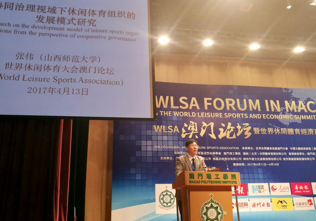 德赢郑旗教授、张伟副教授应世界休闲体育协会邀请,于4月11日赴澳门参加世界休闲体育大会澳门论坛暨世界休闲体育经济高峰论坛(WLSA FORUM IN MACAU & THE WORLD LEISURE SPORTS AND ECONOMIC SUMMIT FORUM),并做专题报告和墙报交流。此次大会邀请了世界各国300多位学者,包括中国、美国、加拿大、法国、澳大利亚、英国、日本、俄罗斯、越南等九个国家和香港、澳门、台湾三个地区的政界、学界和商界的学者与企业家,会议地点设在澳门理工学院。