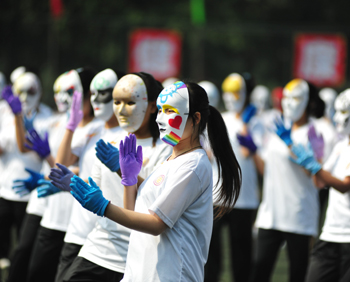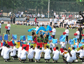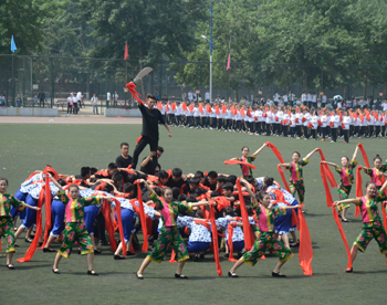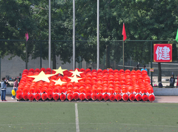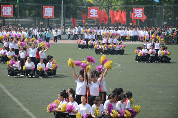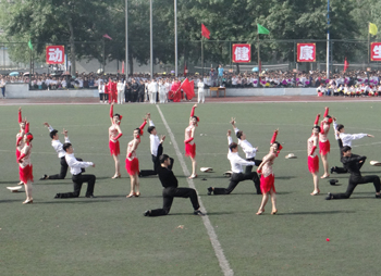 上午九点,运动会正式拉开帷幕。我校国标舞队进行开场舞表演,女生着红色短裙,男生着黑色西装,活力四射的舞蹈令整个田径场沸腾。随后,独具学院特色的团体操比赛有序进行。打头阵是新成立的书法学院,他们以太极为主,彰显博大的中华文化;文学院文用红黄相间的旗帜摆出“2015”“师大”“文院”“文武”的字样展示“文动乾坤,气冲霄汉”的气势;教育技术与传媒学院在黄河大合唱的旋律中带我们重走红色征程,用肢体动作诠释中华精神。随后的比赛中,各学院代表队分别利用彩带、彩旗、扇子、绸带等道具,不断摆出造型,变化队形。“国旗”、“团旗”、“中国梦”等跃然呈现在绿茵场上。全校师生沉浸在这片欢乐青春活力与激情热烈的气氛中。