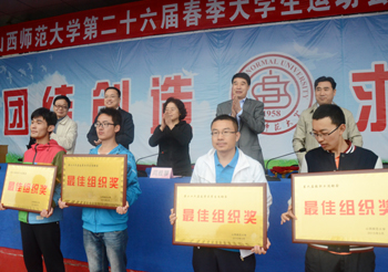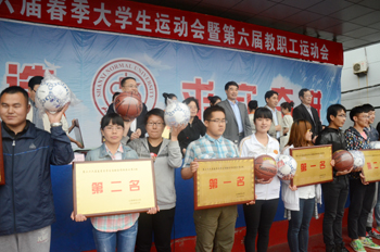 运动会总裁判长何涛宣布比赛成绩:团体操A组前三名分别是历史学院、政法学院、生命科学学院,B组前三名分别是外国语学院、音乐学院、化材学院。教职工组前六名分别由生科学院、机关一工会、机关二工会、图书馆工会、外国语学院、教育学院摘取。物信和化材学院获最佳组织奖。学生团体总分排名前六分别是传媒学院、经管学院、生科学院、物信学院、教育学院和数计学院。音乐学院和地科学院均获得最佳组织奖。与会领导为获奖单位颁发奖牌和奖品。