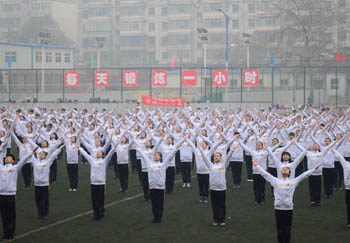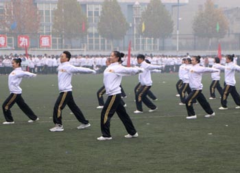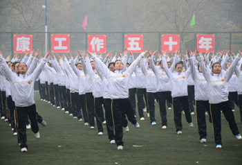 响应共青团中央、教育部号召,我校广泛开展了以“走下网络、走出宿舍、走向操场”为主题的大学生阳光体育运动。11月23日下午,我校在一校区田径场隆重举行了一年一度的广播操比赛。此次比赛共有17个学院,3000余名2014级新生参加。校党委副书记王心平,校体育运动委员会主任、副校长闫桂琴,副校长薛耀文、郝勇东,校体育运动委员会副主任教务处处长范哲峰、校工会主席李春仁、德赢vwin体育官网院长郑旗以及校体育运动委员会委员、各学院领导和机关部门负责人出席了本次开幕式。校体育运动委员会副主任、校办主任薛珠峰主持本次比赛。
