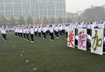 在第九套广播体操的音乐中,广播操比赛开始了,同学们着装统一、动作整齐、身体协调、精神抖擞,宛如初升的太阳,朝气蓬勃。各学院代表队发扬团结一致、奋发向上的精神风貌,体现了当代大学生的青春活力。美术学院用自制的展板展现了学院的专业特点,书法学院黑白双色手套独具特色,文学院作为第一个上场的大院气势宏伟,给在场的老师及观众极大的视觉冲击。