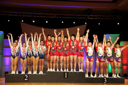 2012年世界健美操冠军赛领奖台上与冠军、亚军合影