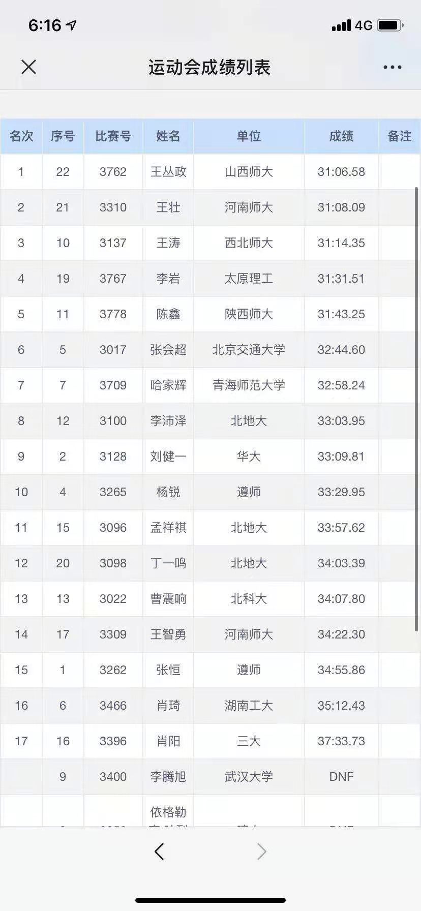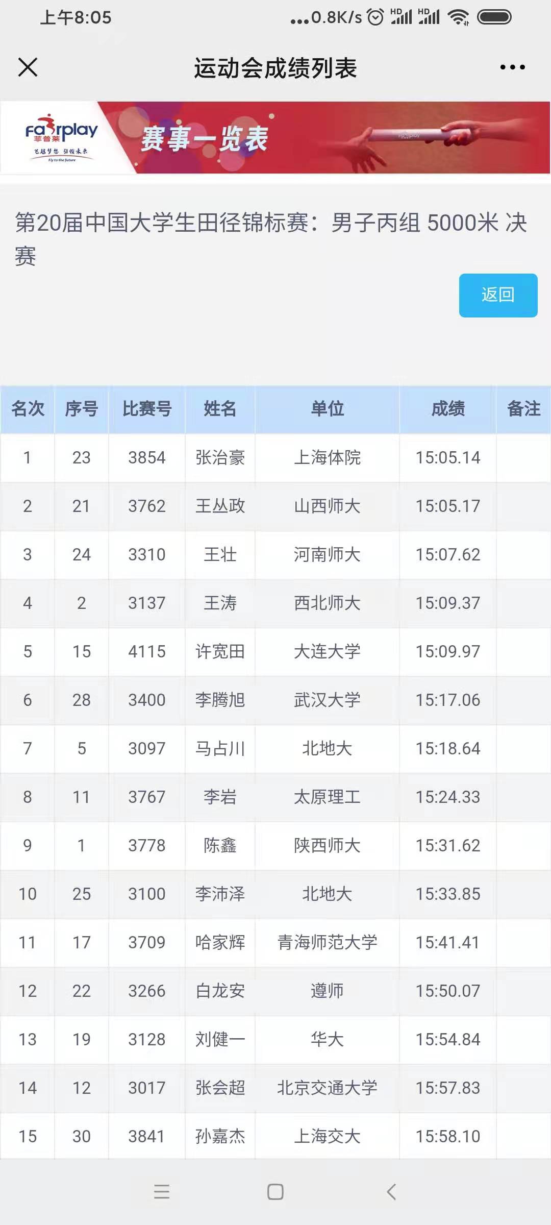 7月31日-8月5日,第20届中国大学生田径锦标赛在浙江大学紫金港校区隆重举行,来自北京大学、北京体育大学、北京师范大学等全国255所高校的2495名运动员参加比赛。在学院大力支持和科学训练保障下,德赢运动训练系学生王丛政在教练员张振老师指导下,经过刻苦训练和奋力拼搏,勇夺男子丙组(高水平)10000米冠军和5000米亚军,创造了我校在该项比赛上的最好成绩。同时,王丛政获优秀运动员,张振获优秀教练员称号。优异成绩的取得,得到了众多参赛高校的高度认同与称赞,为学校赢得了荣誉。