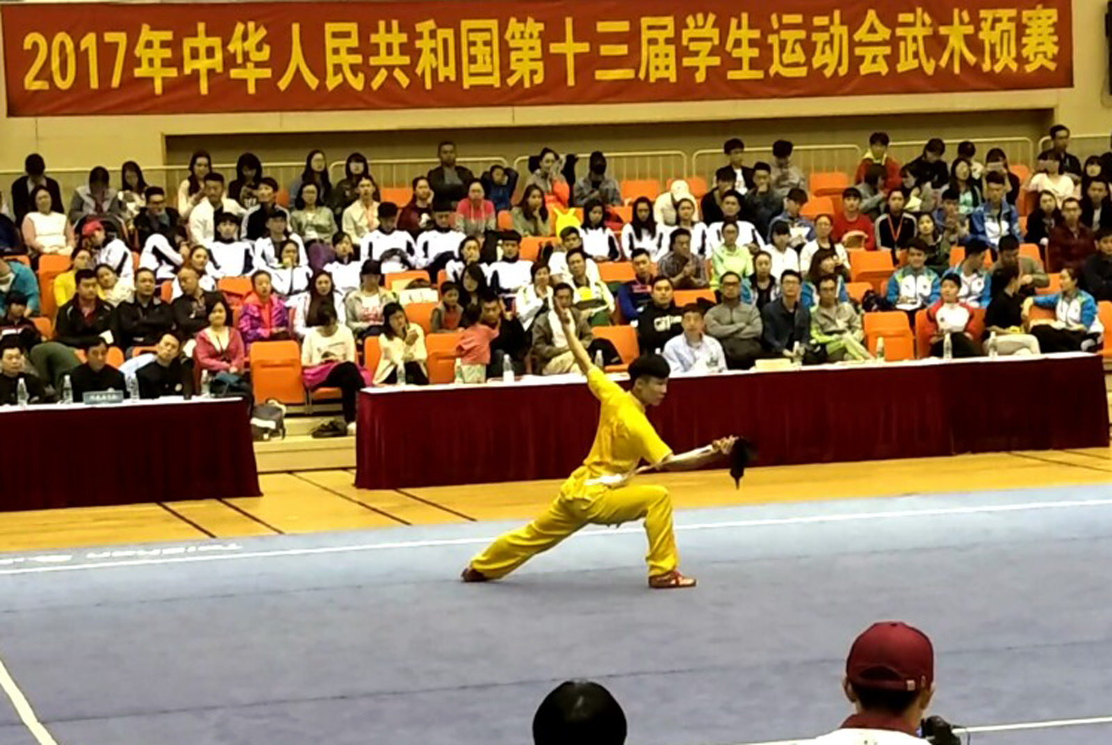 4月19日至24日,教育部、国家体育总局、共青团中央主办的中华人民共和国第十三届学生运动会武术预赛在上海中医药大学落幕,共有来自全国各省、市的24个代表队参赛。我校武术队根据参赛办法,男、女运动员各4人代表山西省大学生参赛,5名运动员挺进决赛。郭石川取得男子剑术第六名和男子枪术第十一名,郭薇取得女子棍术第六名,蒋春春取得女子刀术第九名,郭石川、裴超磊、穆治光取得男子对练第十一名的好成绩。