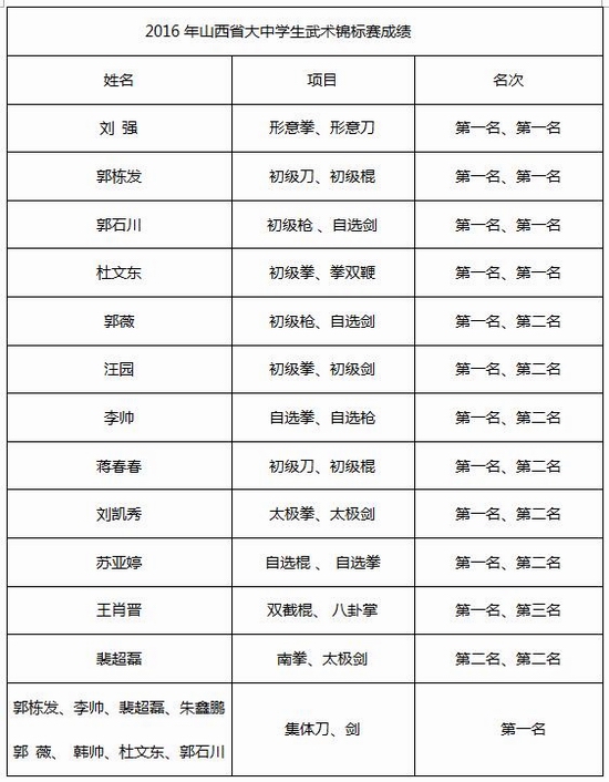 10月21日至24日,2016年山西省大中学生武术锦标赛在山西中医学院举行。来自太原理工大学、中北大学、临汾三中等27所大中学校的314名学生参加了比赛。德赢武术代表队在教练员金涛带领下,共派出14名运动员参赛。全体参赛学生经过团结协作、努力拼搏,最终在所参加的20项拳术器械中,共获16金、8银、1铜的优异成绩。我校参赛选手刘强、郭石川获优秀运动员称号,金涛教练员被评为优秀教练员。此次比赛,巩固了我校武术与民族传统体育专业在山西省高校中的领先优势,并进一步提升了该专业的影响力与知名度。(院办公室/文)