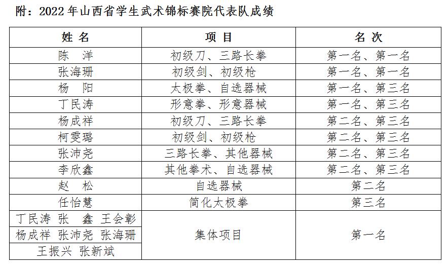 11月18日至21日,由山西省教育厅、山西省体育局主办,山西中医药大学承办的2022年山西省学生武术锦标赛在山西中医药大学举行。受疫情影响,本次锦标赛在线上进行。