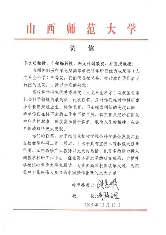 12月19日,我校校党委书记符惠明、校长武海顺向获奖教师发贺信,代表学校并以个人名义向包括乔玉成教授在内的四位获奖者表示祝贺,并勉励广大科研人员应以获奖教师为榜样,积极探索、勇于创新、肩负起将自身发展融入学院、学校发展的责任和使命,为学校争创一流学业学科作出贡献。