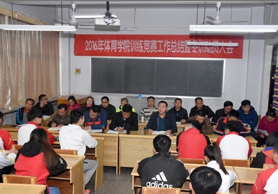 德赢vwin体育官网2016年训练竞赛工作总结暨冬训动员大会在教学楼六教室召开。院党委书记李学刚、院长郑旗,田径代表队、女子足球队、健美操代表队、武术套路代表队等11支代表队全体教练员及运动员代表参加了会议。会议由体育教育系副主任张杰主持。
