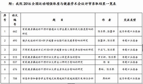 2016年12月8日至11日,全国运动增强体质与健康学术会议在上海德赢vwin体育官网隆重召开。陈乐琴副教授(博士)带领德赢6名研究生参加了本次会议。本次会议是近年来体质与健康研究规模最大的一次学术论文报告会,论文内容涉及体育在健康中国建设中的作用研究、运动促进健康的理论与方法研究、中国国民体质现状与变化规律研究、科学健身方法的机理研究、运动健身新器材的研究与实践、科学健身体系的建设与运行、大数据、新媒体在全民健身公共服务体系中的研究与应用等诸多领域,比较全面地反映了国内外体质与健康促进研究进展和我国体质研究现状。在德赢师生积极投稿和踊跃参与下,本次全国运动增强体质与健康学术会议共录取德赢论文7篇,其中专题口头报告5篇,迷你口头报告2篇,德赢录取的论文数量在同类院校中位于前列。