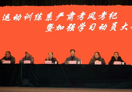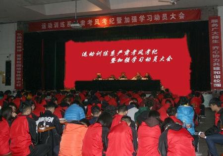 运动训练系严肃考风考纪暨加强学习动员大会是在学院加强学风建设,严肃考风考纪的形势下运动训练系开展的活动之一,此前还为此专门召开了辅导员工作会议、系所属教师工作会议、系微信公众号推送考试纪律、宣传版面进行宣传等多项工作。