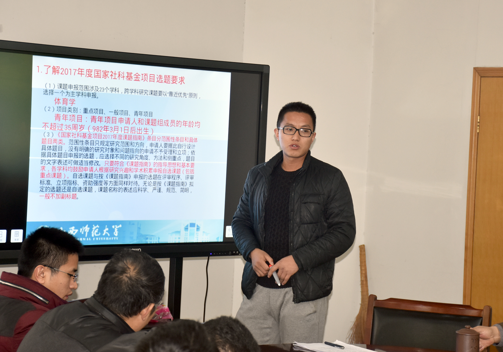 郑旗院长首先传达了校第五届委员会第二次全体(扩大)会议精神,并着重强调2017年度国家基金项目申报工作的重要性,同时要求进一步积极推进申报2017年度国家基金项目的各项工作。冯晓丽副院长汇报了“校国家级项目申报工作交流会”的重要内容,指出了申报国家级项目的必要性和注意事项。随后,各申报人以PPT的形式,对选题题目、研究框架等方面进行了汇报,与会人员当场给予中肯的建议,同时提出了具体修改意见。
