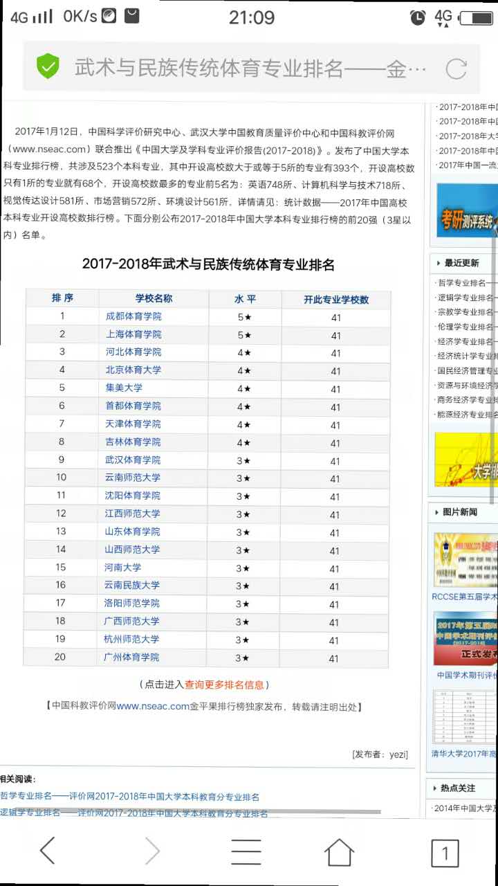 近日,中国科学评价研究中心(RCCSE)、武汉大学中国教育质量评价中心(ECCEQ)联合中国科教评价网(www.nseac.com)推出《中国大学及学科专业评价报告(2017-2018)》。这是RCCSE连续第14次发布中国大学及学科专业评价结果。我校武术与民族传统体育专业在全国排名稳步提升,位居3星,位列14位,较去年提升4位。