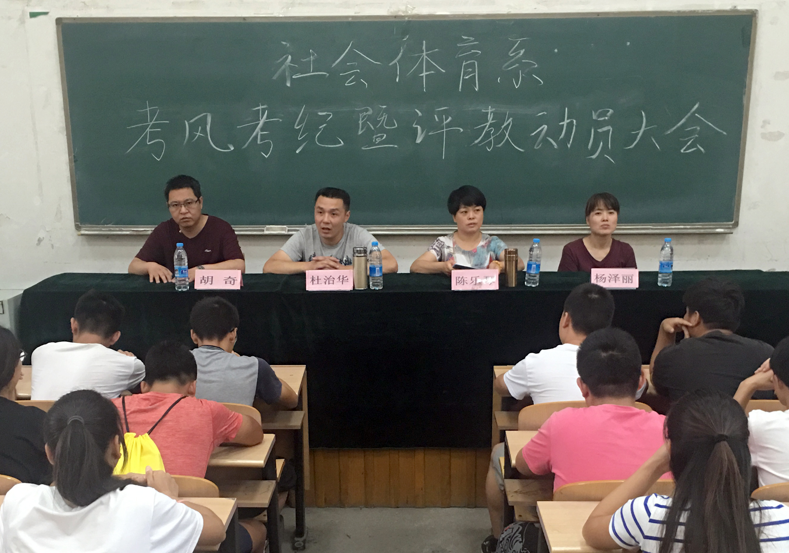 让舞弊远离校园,让诚信常驻心中。在学期末来临之际,社会体育系于6月20日上午10:30在阶一教室召开了考风考纪暨评教动员大会。社会体育系主任陈乐琴老师、副主任杜治华老师以及社会体育系各班辅导员和全体同学们参加本了本次会议。