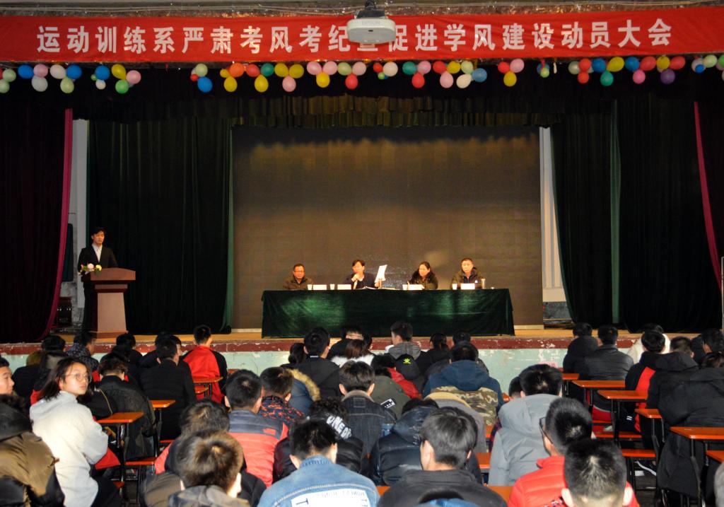 为了进一步加强运动训练系学风建设,端正同学们的考试态度,构建诚信校园,保证期末考试顺利进行。运动训练系于12月27日在德赢vwin体育官网礼堂召开了“严肃考风考纪暨促进学风建设动员大会”,倡导同学们“端正考风、严肃考纪、规范答题、诚信应考”。参加本次会议的领导老师有:运动训练系主任张伟老师、辅导员王文武老师、高琴老师和贾建学老师。
