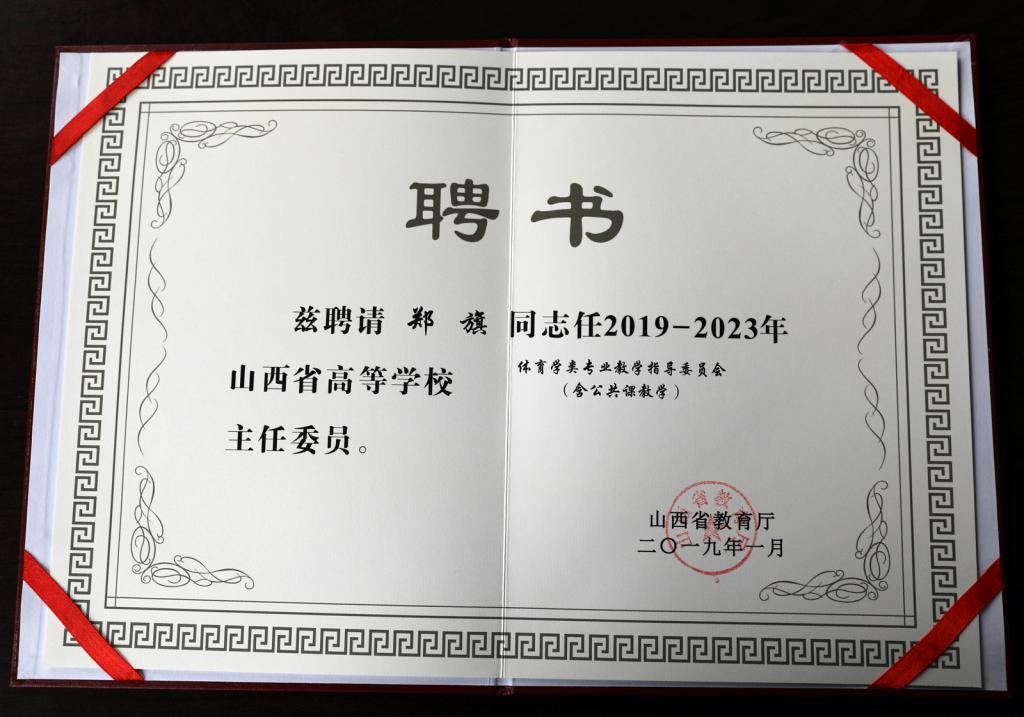 会上,孙世新宣布成立山西省2019-2023年高等学校教学指导委员会。会议为全省高校教指委各专业委员会主任委员代表颁发了聘书。德赢郑旗教授被聘为山西省高等学校体育学类专业教学指导委员会(含公共课教学)主任委员。(院办供稿)