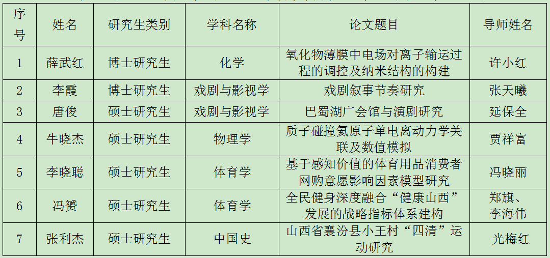 日前,山西省人民政府学位委员会办公室公布2018年山西省研究生优秀学位论文(晋学位办[2019]1号),德赢2篇论文入选优秀硕士学位论文。据悉,2018年度我校共有2篇博士学位论文、5篇硕士学位论文入选山西省研究生优秀学位论文。(院办供稿)