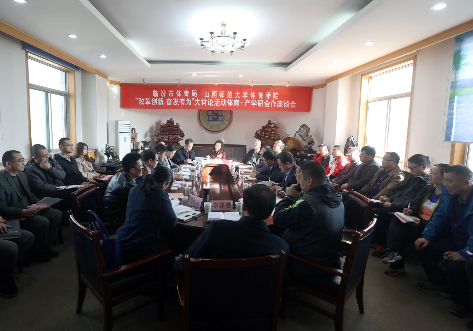 3月15日下午,德赢vwin体育官网与临汾市体育局“改革创新,奋发有为”大讨论活动体育+产学研合作座谈会在三校区东会议室举行。临汾市体育局党组书记、局长陈海平、副局长段晓娜,临汾市体育运动学校党总支书记、校长牛鸿翔、副校长曹鹏、尹建峰、张敏等一行14人出席,院党委书记李学刚、院党委副书记孙学虎、副院长卢向阳、王江,各系部科室主要负责人及教练参加。座谈会由院长郑旗主持。