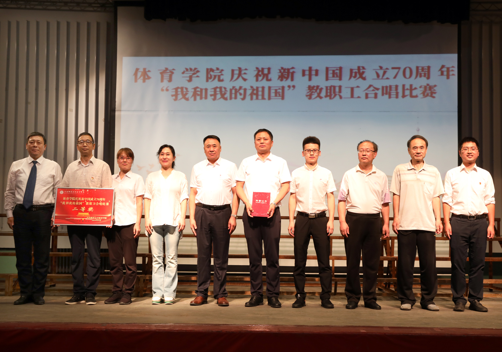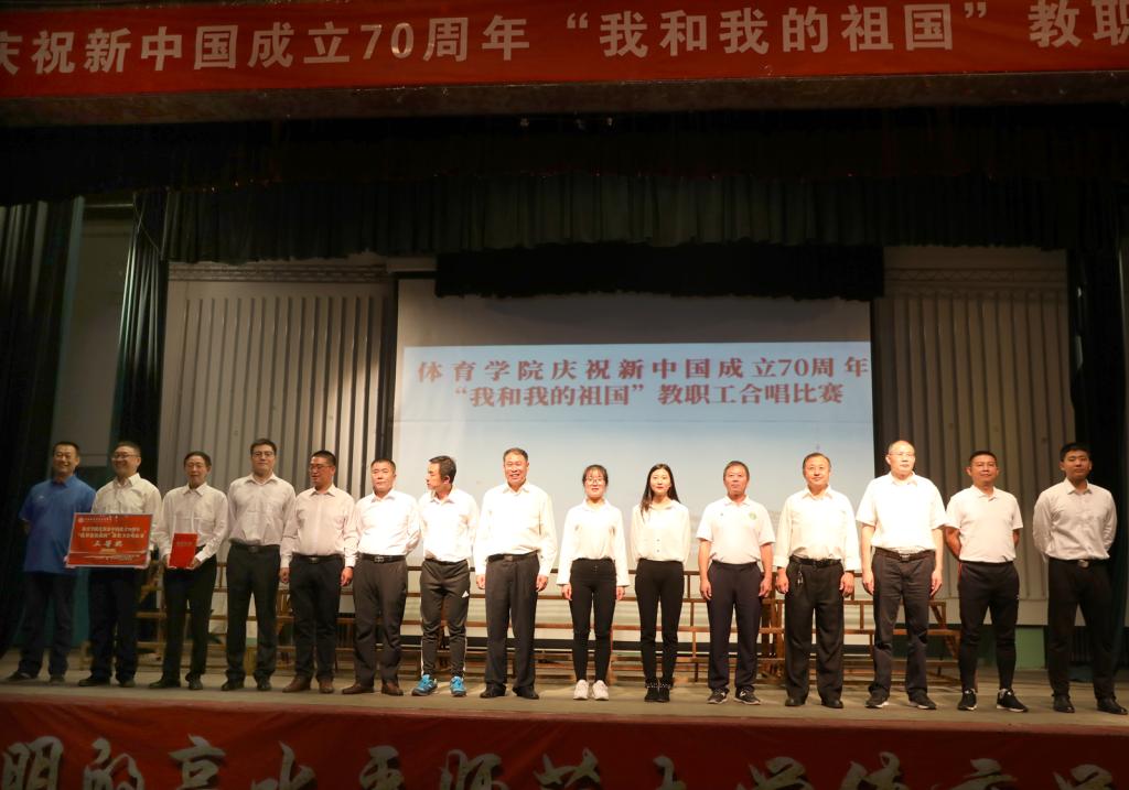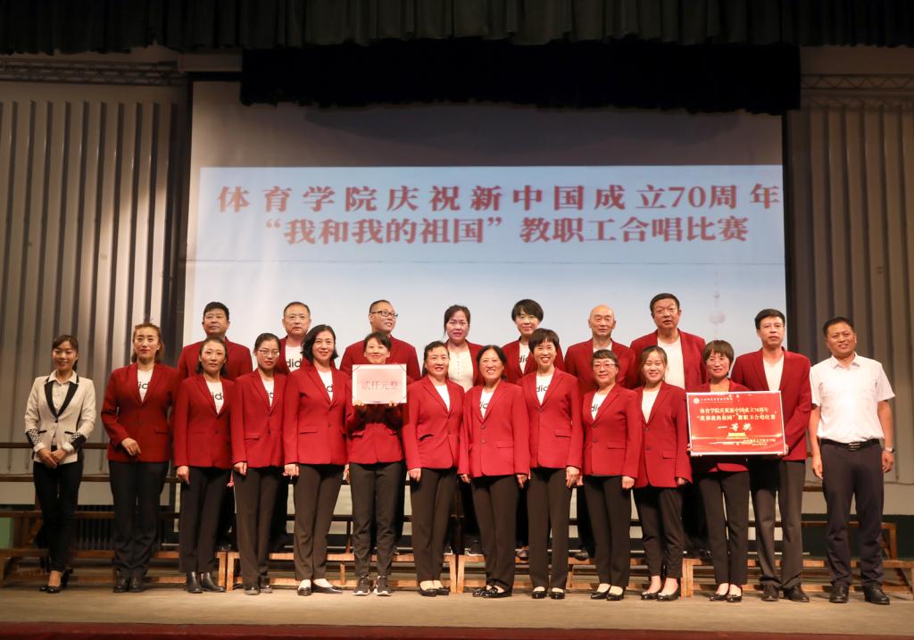 赛前,各支参赛队伍利用课余时间都进行了紧张有序的排练。比赛现场,各支队伍的着装统一,精神饱满,神情自信从容,歌声或悠扬婉约,或大气磅礴。他们纵情高歌,唱响了新时代的梦想与旋律,以饱满的激情、嘹亮的歌声演唱了《我和我的祖国》、《团结就是力量》,展现了德赢vwin体育官网教职工积极向上、励志图强的精神风貌,现场的呐喊助威声将比赛推向高潮。7支队伍合唱结束后,由音乐学院的评委为大家倾情演唱了《不忘初心》,赢得了现场阵阵掌声。经过激励角逐和评比,公共体育部代表队、院机关代表队和体育教育二系分别获得了一、二、三等奖,体育教育系代表队、运动训练系代表队、社会体育系代表队、武术与民族传统体育系代表队获得了优秀奖,院领导及院工会主席为获奖队伍进行了颁奖。最后,全体教职工进行了合影留念并集体合唱了《团结就是力量》。