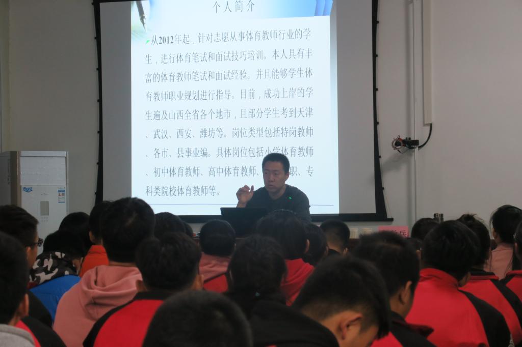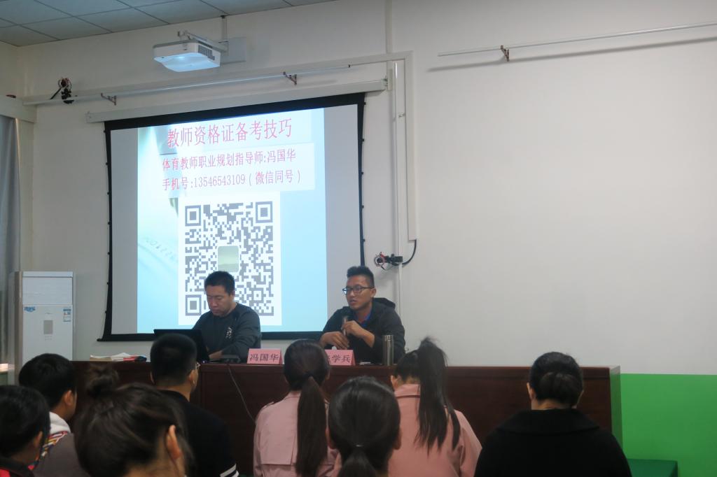 在学院“不忘初心、牢记使命”主题教育期间,为了提升我系教师资格证考试通过率。2019年10月31日中午,在体院生物力学实验室举办了由体育教育系党支部主办、系团总支学生会承办的2017级本科生教师资格证考前培训讲座。此次讲座邀请了临汾职业技术学院冯国华老师做了“教师资格证书备考技巧与职业规划”为主题的培训讲座。体育教育系副主任张学兵、2017级本科生及部分硕士研究参加了此次讲座。