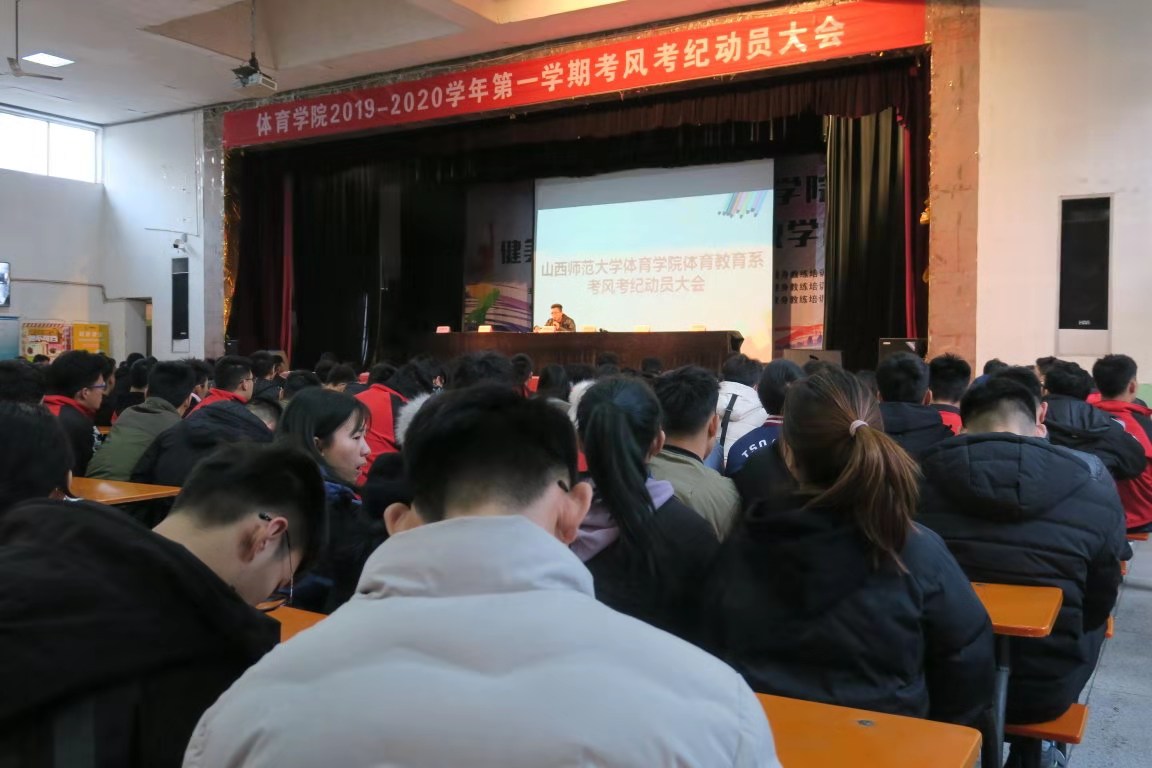 12月27日下午,体育教育系在大礼堂召开2019—2020学年第一学期考风考纪动员大会。院团委副书记程祖浩、体育教育系副主任张学兵、各班辅导员及体教系全体学生参加了本次大会。大会由院团委副书记程祖浩主持。