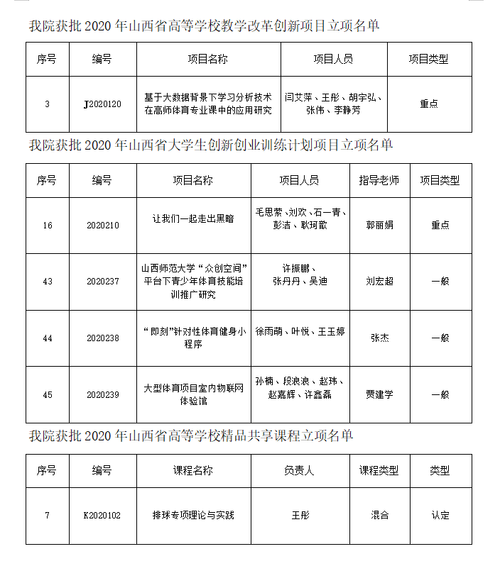 近日,山西省教育厅发布《关于公布2020年山西省教学质量提升工程各类项目立项名单的通知》,公布2020年山西省教学质量提升工程各类项目立项名单。德赢各类项目共获批立项6项。其中获批教学改革创新重点项目1项,大学生创新创业训练计划项目4项(重点1项,一般3项),精品共享课程认定类1门。