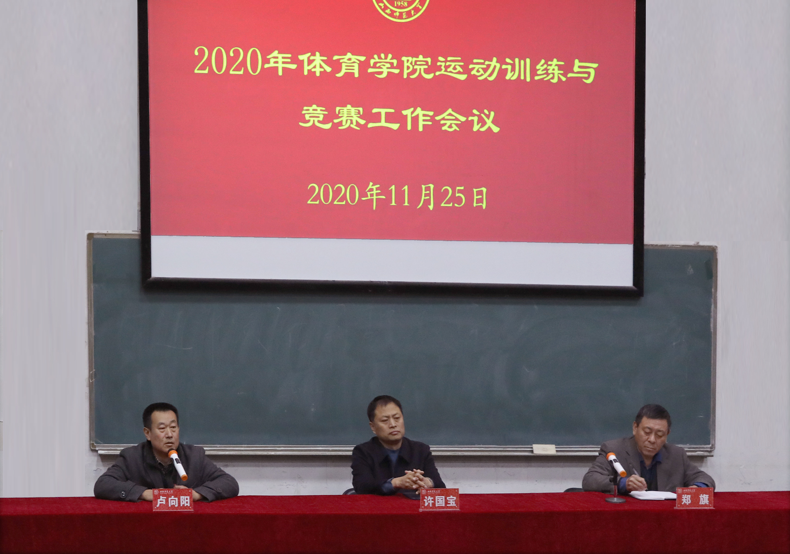 11月25日晚,学院2020年运动训练专题工作会议在阶一教室召开,会议旨在总结疫情期间各项目代表队竞赛训练情况,安排部署代表队冬训与参赛工作。院领导许国宝、郑旗、卢向阳,田径、武术、健美操等12支代表队的教练员,男女篮球代表队及足球代表队学生参加会议。会议由副院长卢向阳主持。