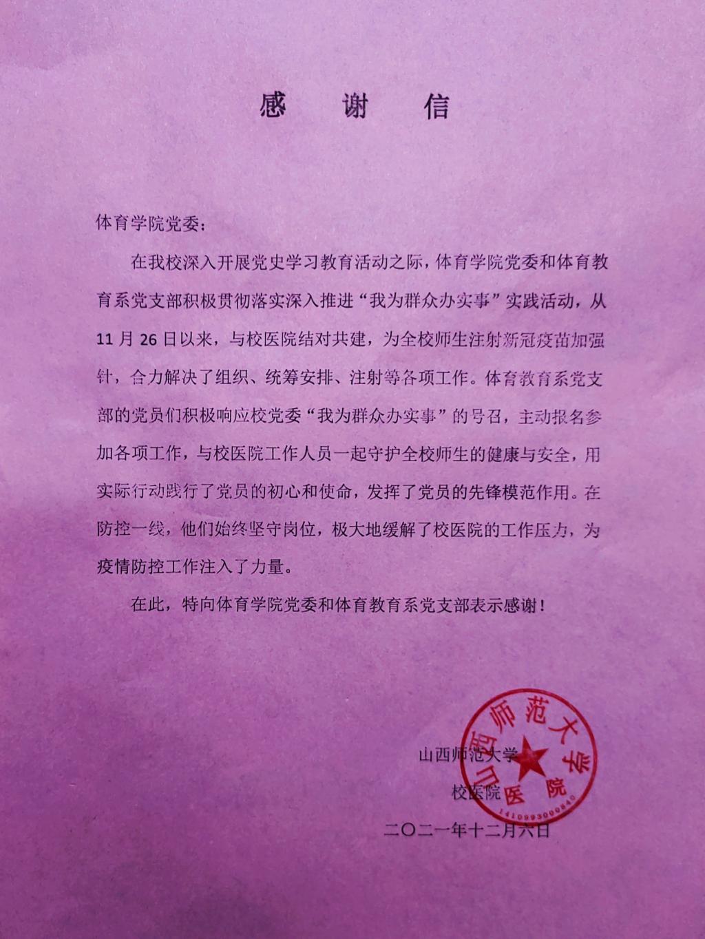 在我校深入开展党史学习教育之际,德赢vwin体育官网党委和体育教育系党支部积极贯彻落实深入推进“我为群众办实事”实践活动,从11月26日以来,在德赢vwin体育官网党委书记许国宝同志和体育教育系党支部书记张杰同志的共同带领下,学生党员利用周末时间与校医院结对共建,为全校师生注射新冠疫苗加强针,合力完成了组织、统筹安排、注射等各项工作,用实际行动践行了党员的初心和使命,发挥了党员的先锋模范作用。在防控一线,他们始终坚守岗位,极大地缓解了校医院的工作压力,为疫情防控工作注入了新的力量。(体育教育系供稿)