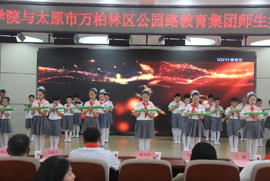 仪式上,公园路小学的同学进行了生动活泼的节目表演。院党委书记卫建平代表学院为公园路教育集团授牌,郑旗院长与郭文亮校长双方代表共同签订了教学科研实践实训基地合作协议。