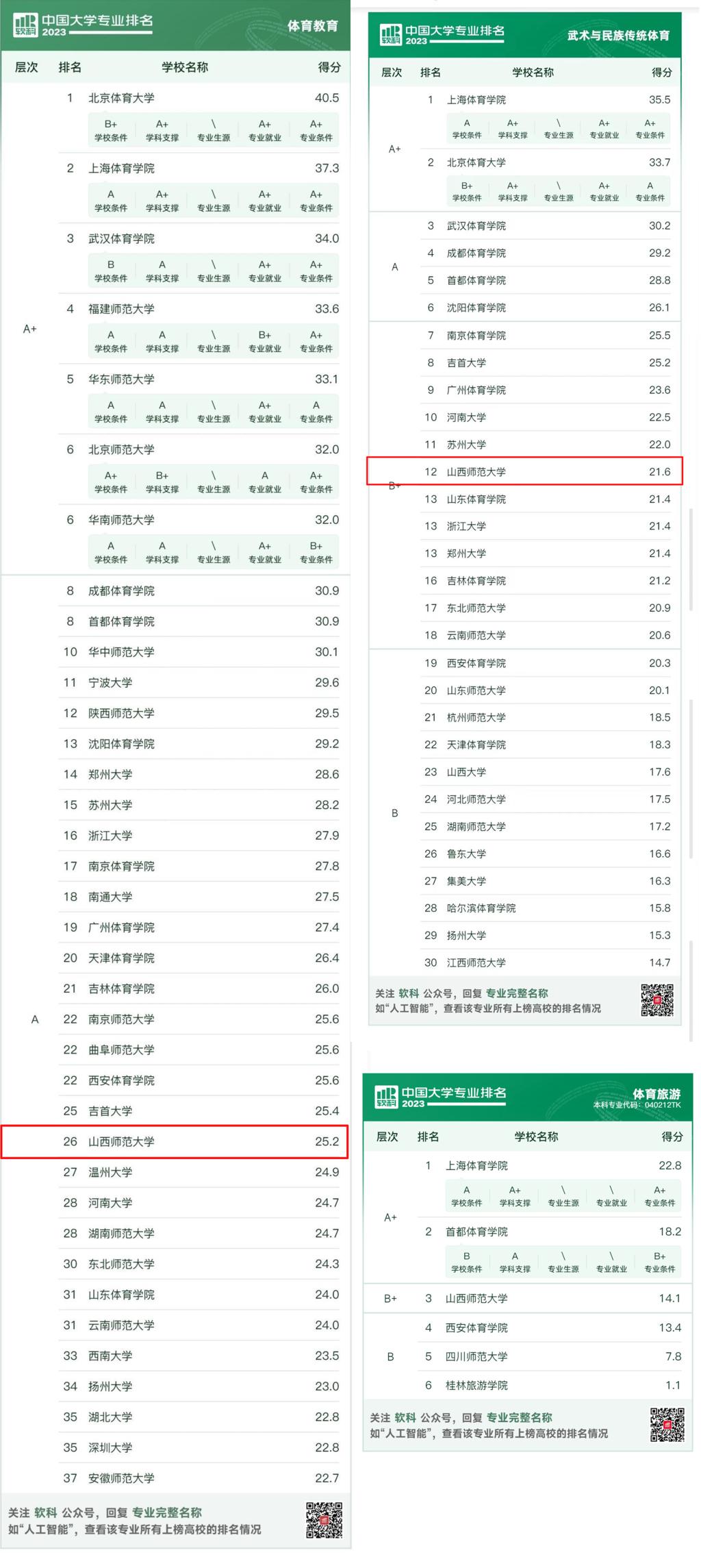 本科教育是高等教育的基石,而专业建设质量则是高校本科教育的根基所在。在发布的榜单中,德赢体育教育(国家一流专业建设点)、社会体育指导与管理(省级一流专业)、武术与民族传统体育专业(省级一流专业)位居山西省前列。据悉,软科中国大学专业排名是覆盖专业数量最多、参评专业规模最大的中国大学本科专业排名。评价体系由学校条件、学科支撑、专业生源、专业就业、专业条件5个指标类别组成,下设25项测量指标。专业综合评级分为6档,排名位次为前2%或前2名的为A+级,2%-10%的为A级,10%-30%的为B+级,30%-50%的为B级,50%-70%的为C级(不发布), 70%以后的为D级(不发布)。(院办供稿)