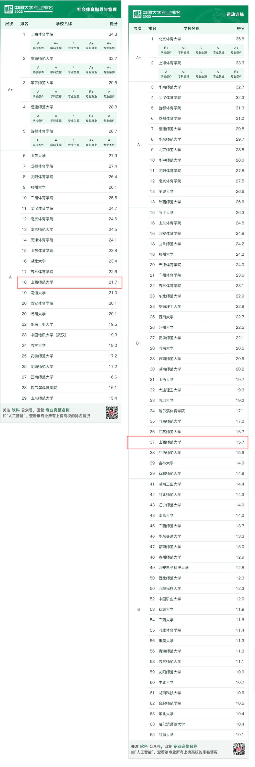 2023年6月15日,高等教育专业评价机构软科发布了“2023软科中国大学专业排名”,排名包含787个本科专业,涉及93个专业类、12个专业门类,共有1076所高校的30772个专业点上榜。德赢5个本科专业全上榜,专业排名与2022年相比有所上升,其中评级为A层次的两个专业为体育教育(位列全国26位,上榜专业数184个)和社会体育指导与管理(位列全国第18位,上榜专业数141个);评级为B+层次的三个专业分别为武术与民族传统体育(位列全国第12位,上榜专业数30个)、运动训练(位列全国第37位,上榜专业数65个)和体育旅游(位列全国第3位,上榜专业数6个)。