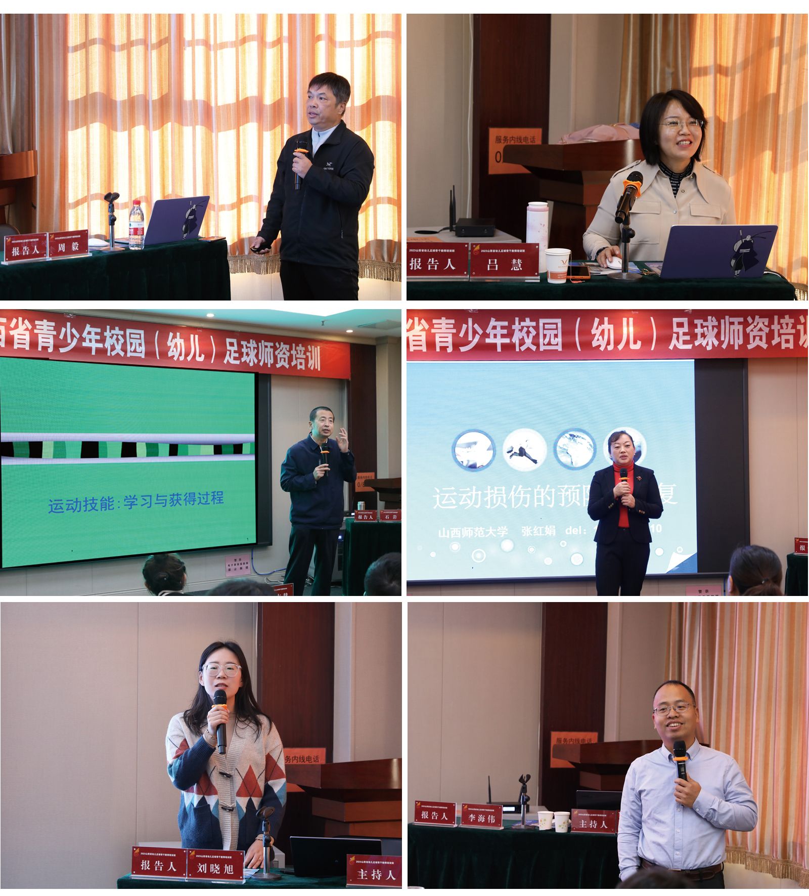 此次培训包括幼儿足球活动基本规范、活动安全、教学实训和幼儿足球教学经验分享等单元主题。广州德赢vwin体育官网周毅教授专题讲授了《开展幼儿足球活动的热点与实施的逻辑支点》,从动作发展与学习对幼儿认知的影响讲解了学前教育的重要性。山西大学吕慧副教授从足球项目技能的选择与编排、动作技能发展的进阶与考量、健康行为养成的引导与内化、体育精神培养的启蒙与感知四个方面讲解了《幼儿足球活动方案设计理论与实践》;山西大学德赢vwin体育官网院长石岩教授分享了《幼儿足球动作技能学习》。德赢vwin体育官网李海伟教授、张红娟副教授、刘晓旭博士分别作了《幼儿体适能的评定及训练》、《幼儿运动性伤病的诊疗、预防与康复》、《幼儿运动心理发展》专题培训。