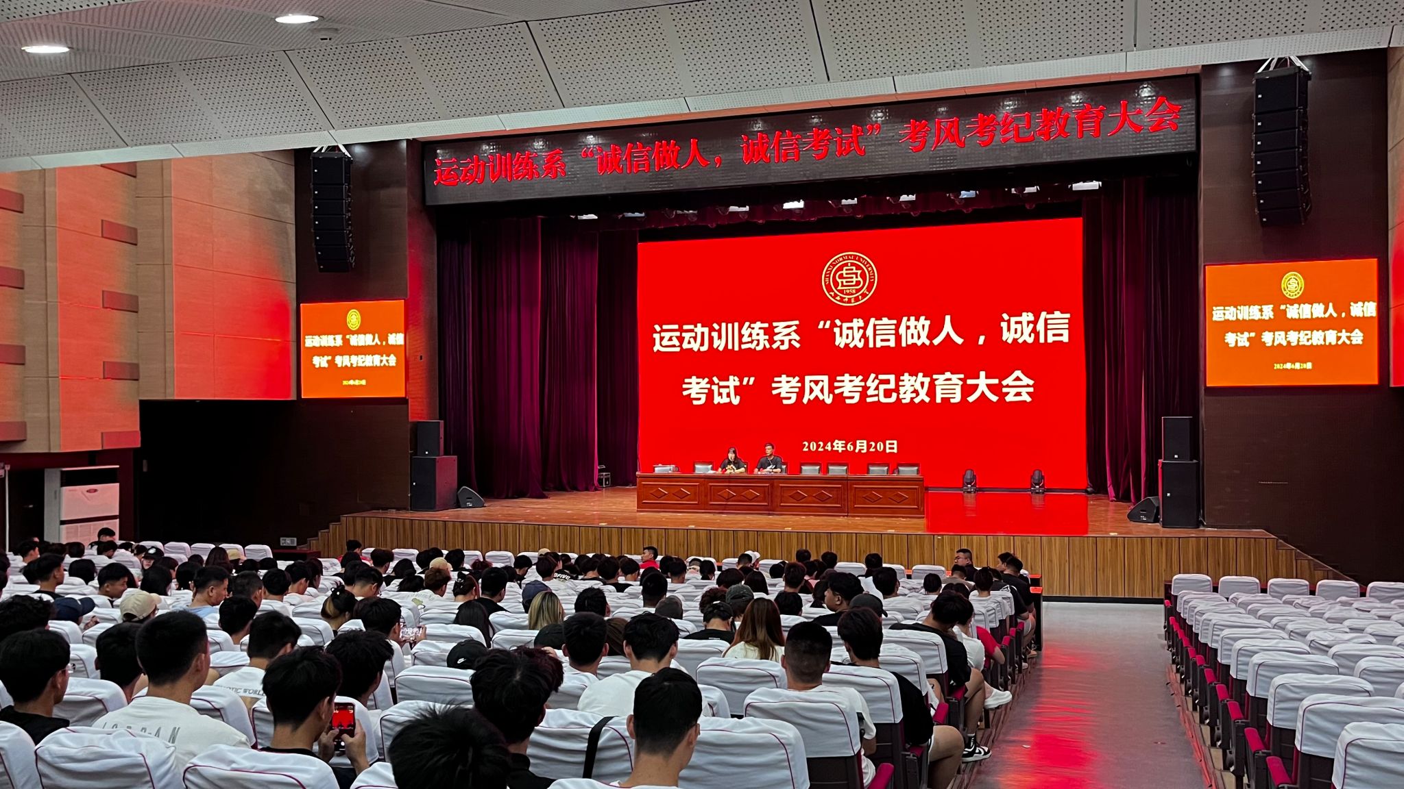 为进一步严肃考风考纪,营造诚信考试的良好氛围,提高学生复习积极性,树立正确的学习观,以优异的成绩迎接2023-2024第二学期期末考试,德赢vwin体育官网社会体育系于2024年6月17日在实验楼一层报告厅召开了考风考纪主题教育大会,系主任李俊明、系副主任张学龙、辅导员戴羽、谢宏梅、任磊、白翊辰、以及社会体育系全体同学参加了大会。