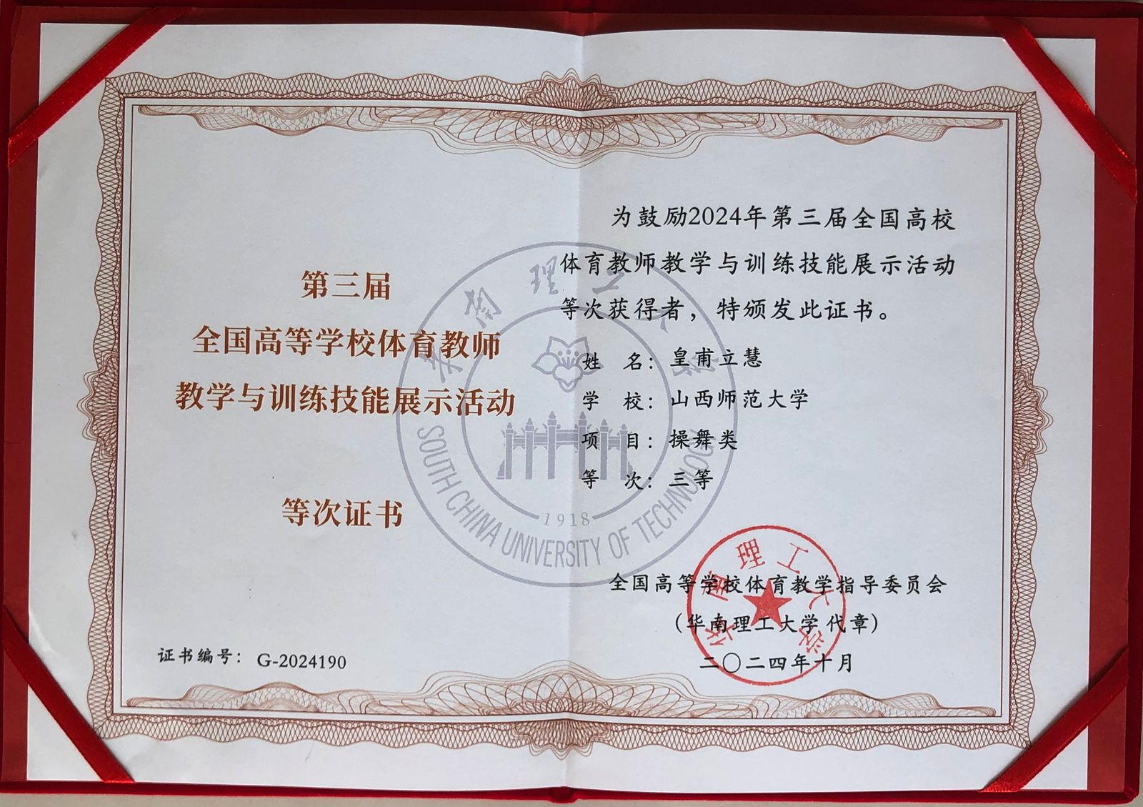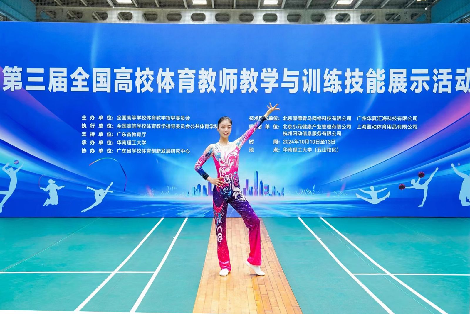 2024年10月10至13日,由全国高等学校体育教育指导委员会主办的第三届全国高校体育教师教学与训练技能展示活动在华南理工大学举办,来自全国各地的103所高校,214名精英体育教师展开了一场精彩纷呈的技能比拼。由德赢公体部刘静主任带队,皇甫立慧老师、刘朋溪老师组成的参赛队伍,分别参加了健美操项目、羽毛球项目的比赛,在赛场上充分展示了德赢教师特色新颖的教学风采和积极进取的精神风貌,皇甫立慧老师荣获操舞类项目全国三等奖。