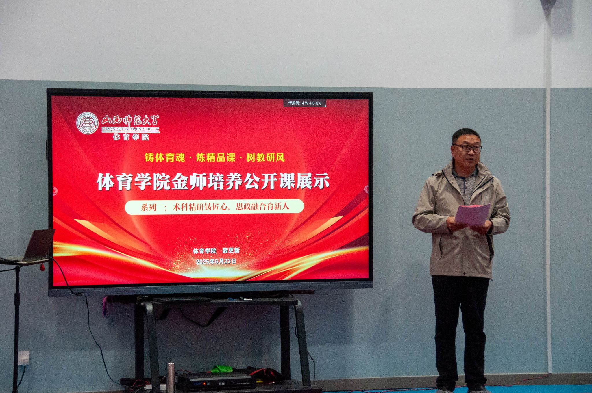 2025年5月23日14:00,德赢vwin体育官网“铸体育魂・炼精品课・树教研风” 系列(二)“术科精研铸匠心,思政融合育新人”第一次展示活动在实训楼展开。本次公开课授课教师为武术与民族传统体育系薛更新老师和卢煜老师,薛更新老师荣获德赢vwin体育官网教师教学创新大赛二等奖,卢煜老师带领德赢代表队取得多项优异的竞赛成绩。德赢vwin体育官网领导、全体教师、部分学生齐聚现场观摩了此次公开课,此次公开课由德赢vwin体育官网副院长李向前主持。