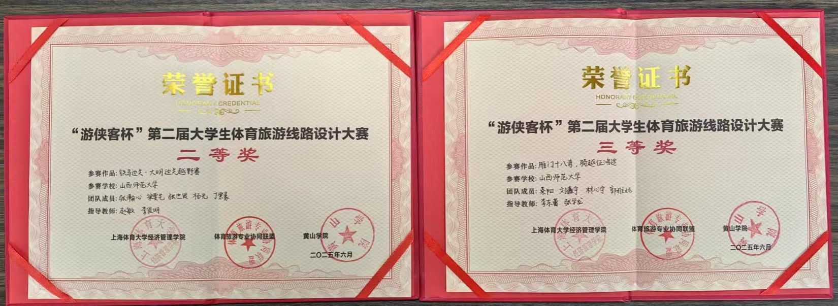 2025年6月4日,"游侠客杯"第二届大学生体育旅游线路设计大赛决赛在安徽省黄山市圆满落幕。我校德赢vwin体育官网体育旅游专业和社会体育指导与管理专业7名同学在李俊明和李东蕾老师带领下参赛,分别凭借作品《铁马边关·大明边关越野赛》和《雁门十八弯·骑征越鸿途》荣获大赛二、三等奖。