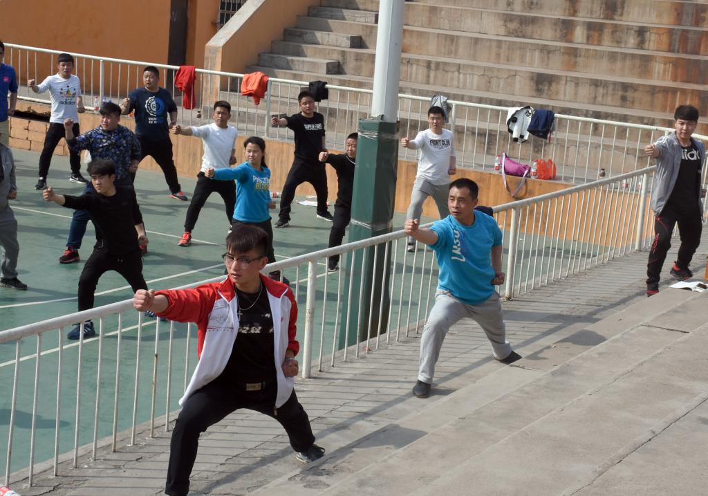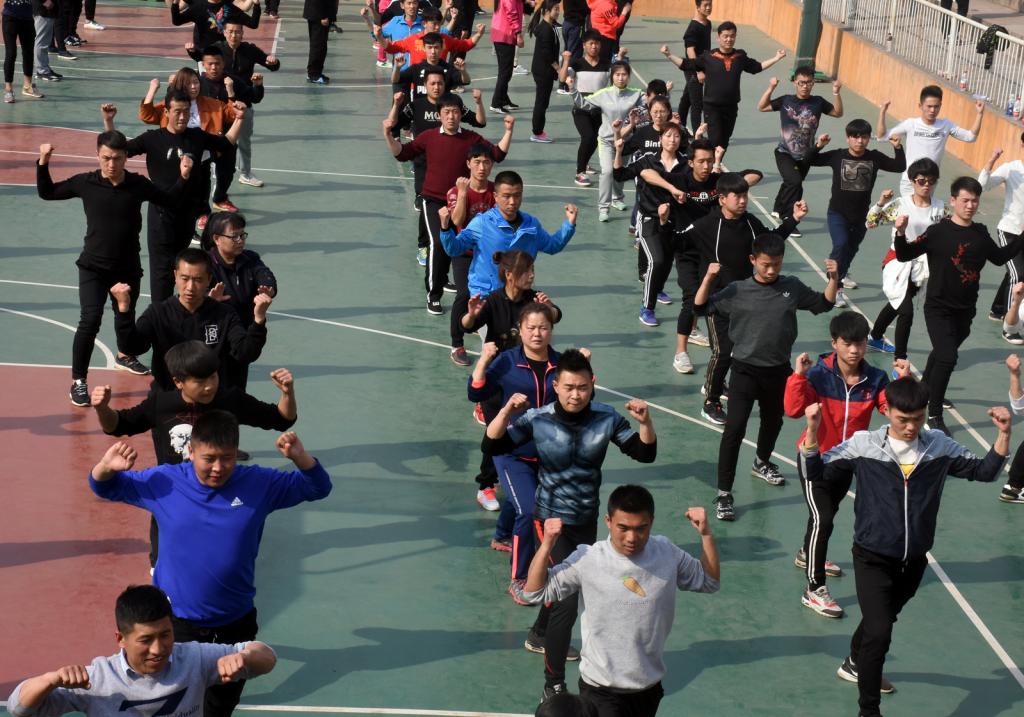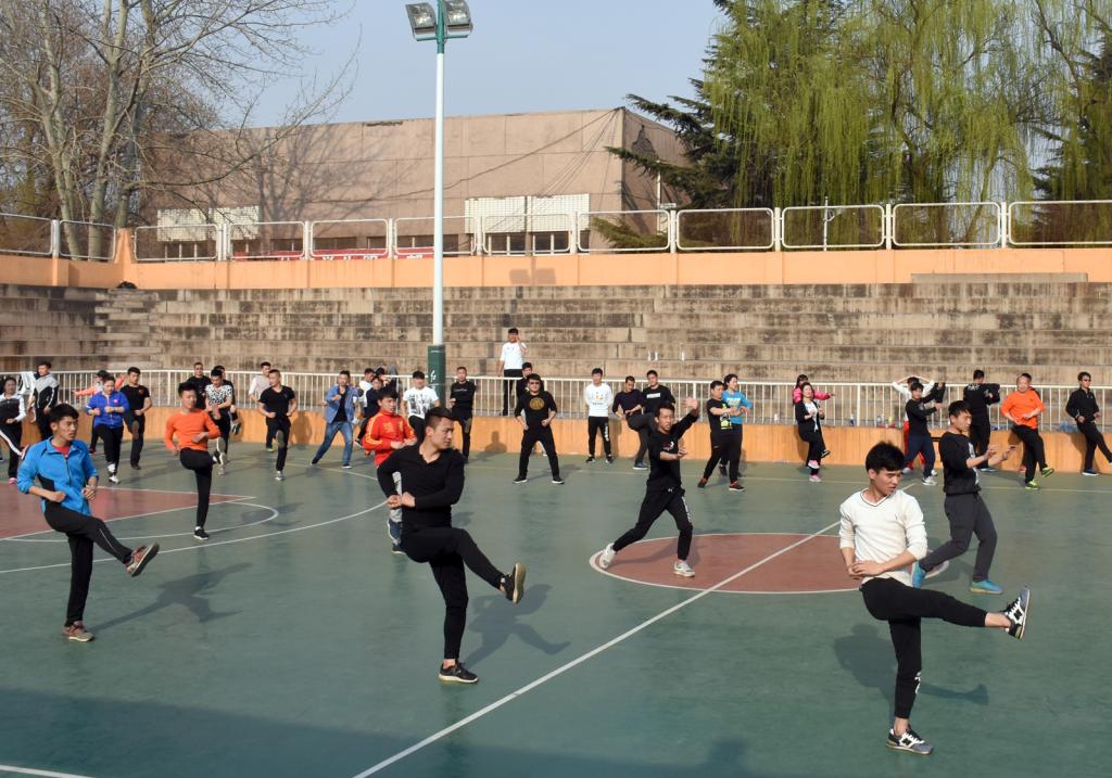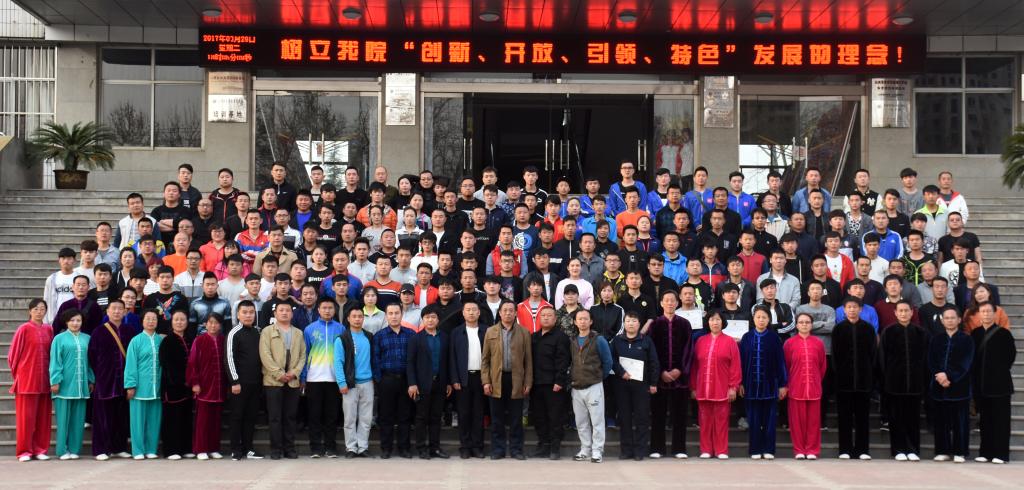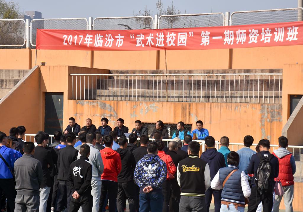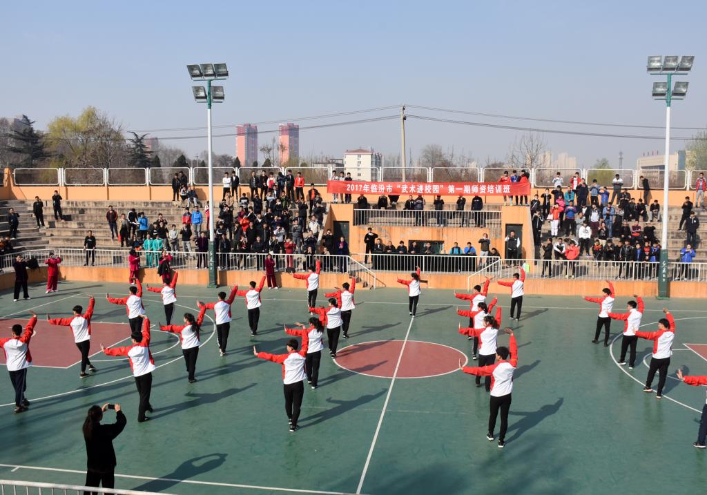 为响应国家提倡武术进校园政策,全面开展临汾市武术进校园活动,3月28日,2017年临汾市“武术进校园”第一期师资培训班在德赢vwin体育官网灯光篮球场举办。来自全市60家武术培训机构的教练员、部分中小学体育教师共180余人参加培训。德赢vwin体育官网副院长卢向阳出席开班仪式并讲话,民族传统体育系主任赵道卿宣布培训班开班,民体系副主任权黎明主持开班仪式。德赢青年教师刘剑讲师、高贯发讲师担任主讲老师。开班仪式上,民体系学生做了精彩的武术健身操表演。