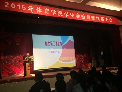 10月12日晚7点30分,2015年德赢vwin体育官网换届暨纳新大会在大礼堂隆重召开。出席大会的领导老师有院党委书记李学刚、院团委书记龙勋、团委老师李风华、民族传统体育系主任赵道卿、体育教育系副主任张杰、社会体育系副主任杜治华、体育教育二系副主任李向前、校学生会主席田野、校学生会副主席郭田宇、院学生会主席焦峰剑及全体学生干部,2015级全体新生参加了本次会议。