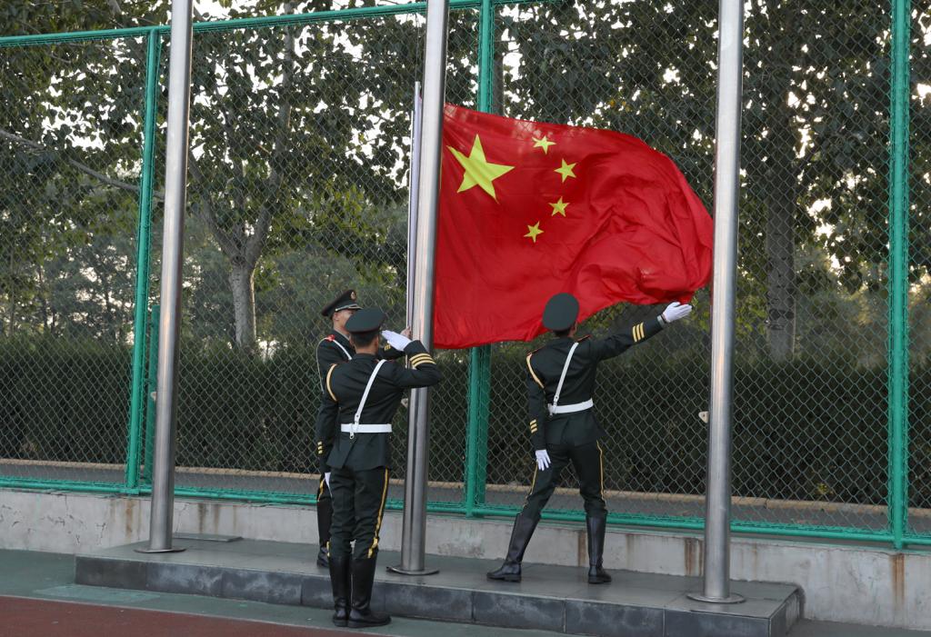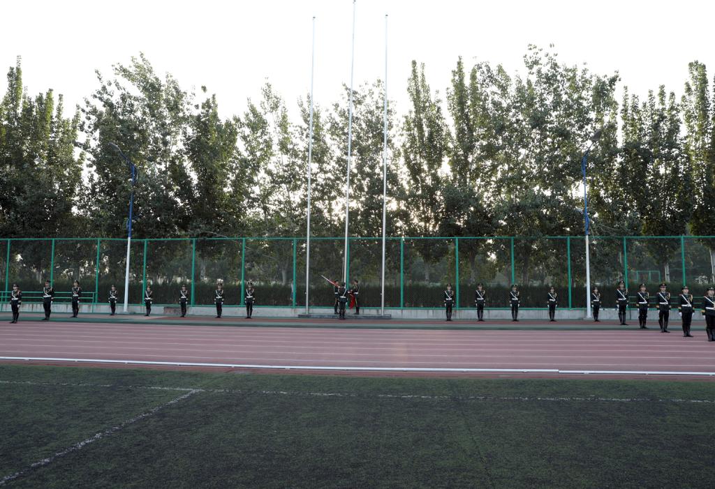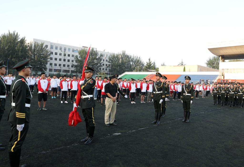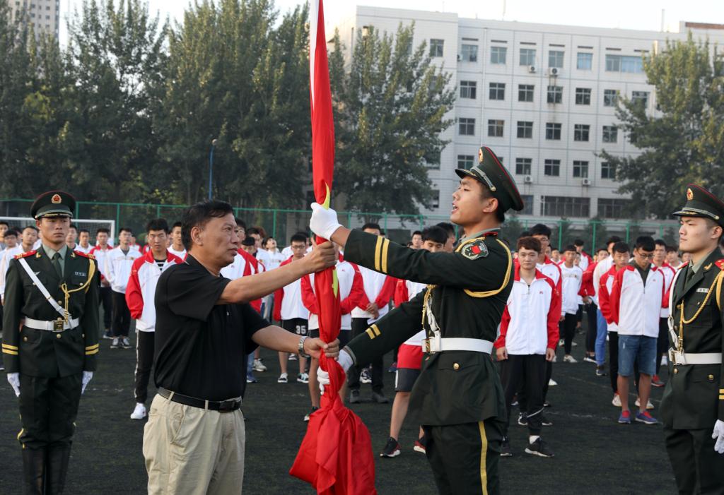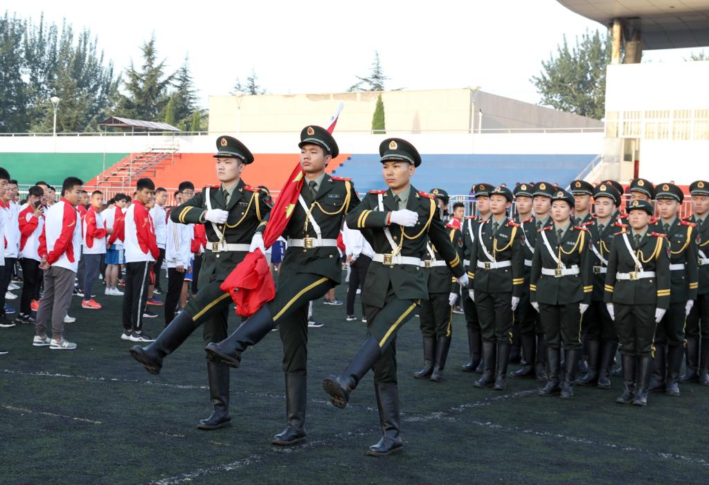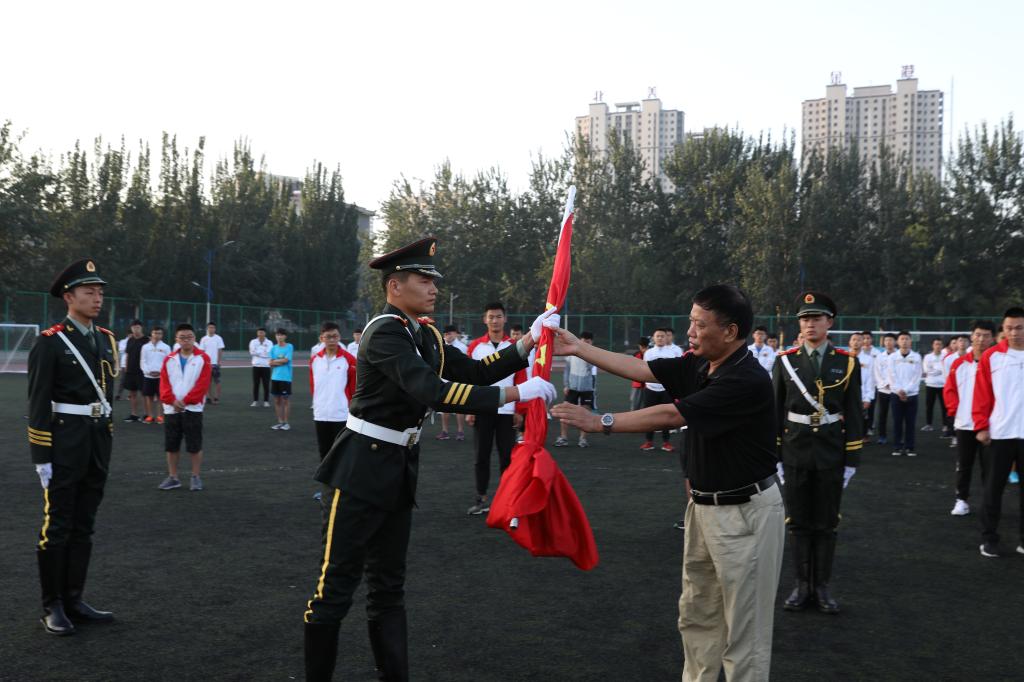 第十三届、十二届国旗护卫队队员在《解放军进行曲》的嘹亮声中步入田径场,院党委书记李学刚为第十三届国旗护卫队授旗,第十三届国旗护卫队迎接国旗并进行新学期升国旗。