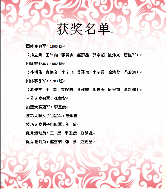 十一天的比赛更是精彩纷呈。在赛场上,每个队员都积极跑位、为队友作掩护,还不时有精妙的传球、漂亮的配合和精彩的上篮,激烈的比赛让场下的观众为之欢呼。最终1802班和1803班一路过关斩将,脱颖而出,进入冠亚军争夺赛。决赛中,1803班一上来就表现出极强的取胜欲望,快攻猛打,利用外线精准的三分球迅速拉开分差,现场氛围一度高涨。1802班及时调整战术,稳扎稳打,奋起直追,场下同学的加油呐喊声一浪高过一浪。最终1803班顶住压力取得胜利,获得本次迎新篮球赛的冠军!
