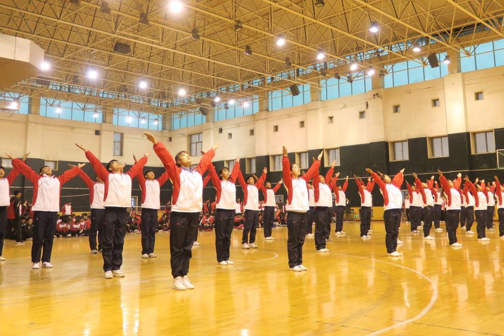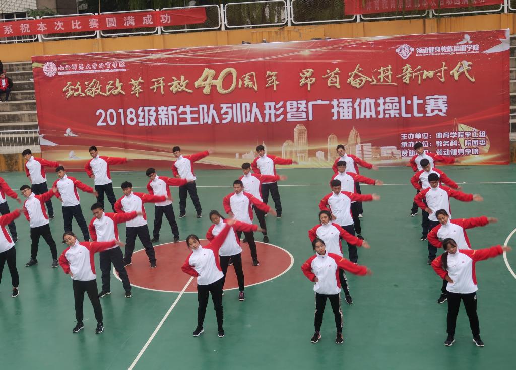 2018级新生队列队形暨广播体操比赛分甲乙组进行,其中体育教育系和体育教育二系为甲组,运动训练系、社会体育系、民族传统体育系为乙组。同学们身着整洁统一的服装,迈着矫健的步伐,喊着嘹亮的口号,动作整齐划一、伸展优美规范。比赛结束后,武术协会和运动训练系1703班的李俊博同学进行了武术和歌曲的精彩展演。