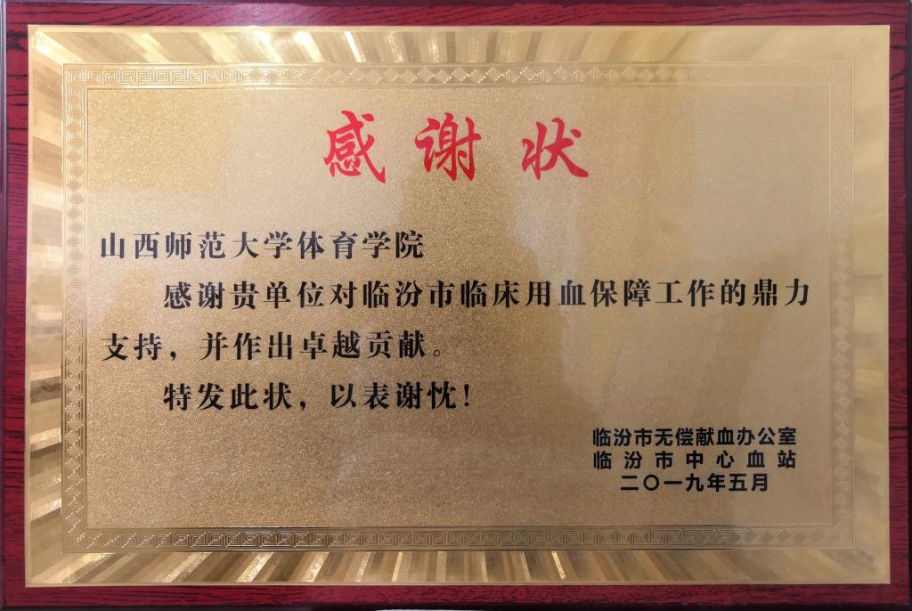 活动结束后,为了感谢德赢师生一直以来热心参与无偿献血这项公益事业,临汾市无偿献血办公室、临汾市中心血站为德赢颁发了“感谢状”,感谢德赢对临汾市临床用血保障工作的鼎力支持,并作出卓越贡献。(院团委供稿)