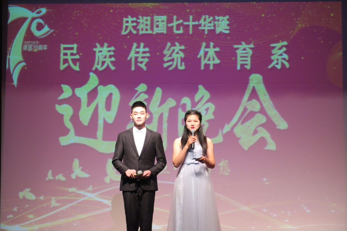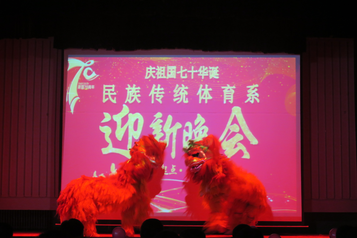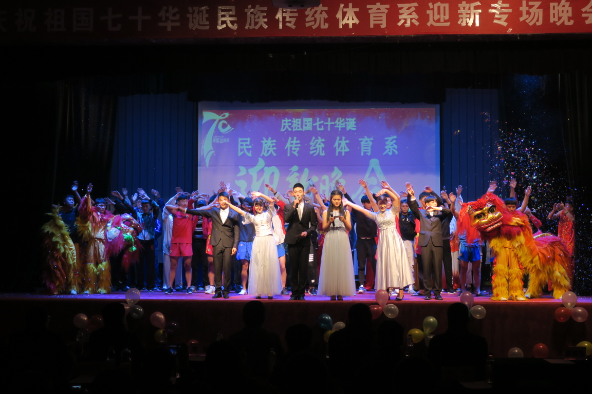 10月23日晚19:00民族传统体育系在三校区大礼堂隆重举行2019年庆祝中华人民共和国七十华诞民族传统体育系迎新晚会。院党委书记许国宝、副院长张伟、体育教育系主任张杰、科室及团委及负责人、民族传统体育系负责人及辅导员与民体系在校学生一起观看了迎新晚会。