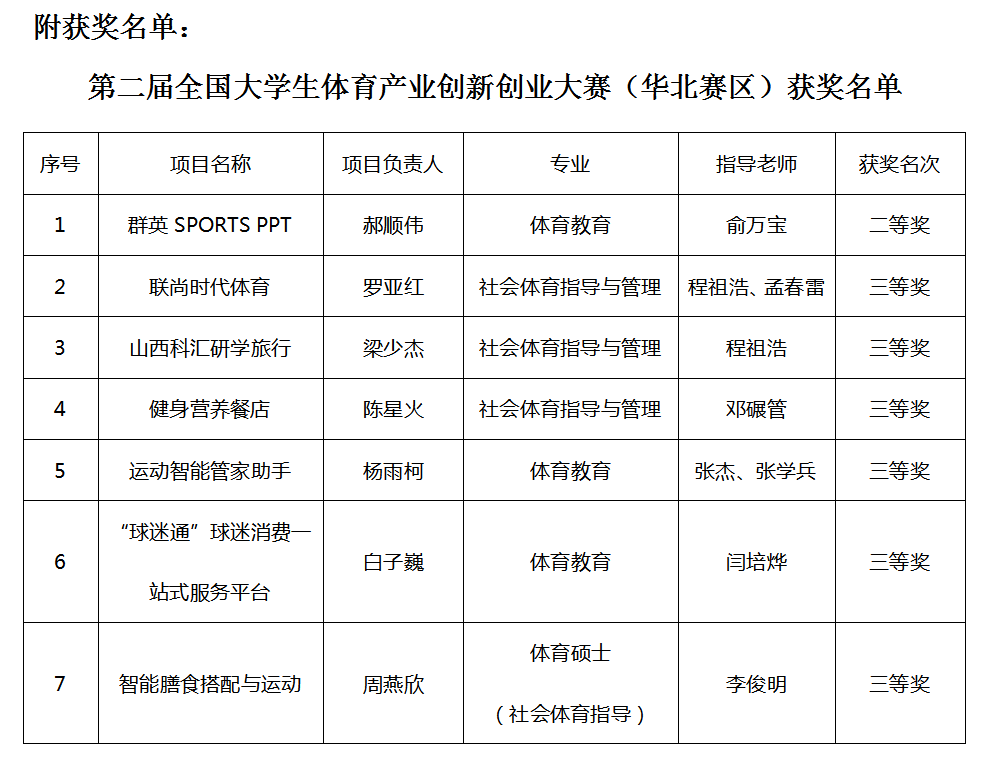 学院高度重视创新创业大赛,经前期宣传动员、网上报名和培训指导,9支队伍脱颖而出。本次体育产业创新创业大赛通过激烈的PPT项目汇报和现场答辩,最终,《群英SPORTS APP》项目荣获二等奖,《智能膳食搭配与运动》等6个项目获得三等奖,程祖浩、孟春雷老师等8位教师荣获“优秀指导教师奖”,我校荣获“优秀组织奖”。