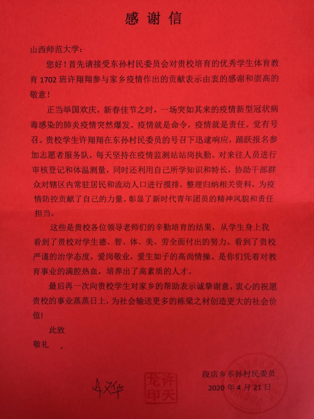 正当举国欢庆新春佳节之时,一场突如其来的疫情—新型冠状病毒肺炎疫情突然爆发。疫情就是命令,体育教育系1702班学生许翔翔在临汾市东村村民委员会的号召下,迅速响应,踊跃报名参加志愿者服务队。志愿期间,他协助本村干部群众对辖区内常住居民和流动人口进行摸排,每天坚持在疫情监测站站岗执勤,并对来往人员进行审核登记和体温测量,整理归纳相关资料等。他说:“是德赢vwin体育官网培养了我,作为一名入党积极分子,我应该积极发挥先锋模范作用,为人民群众、为党和国家贡献自己的力量,和全国人民一起抗击疫情!”。他利用自己所学知识和特长,为疫情防控贡献了自己的力量,得到了本村干部群众的高度认可与赞扬,也彰显了新时代青年团员的精神风貌和责任担当。(体育教育系供稿)