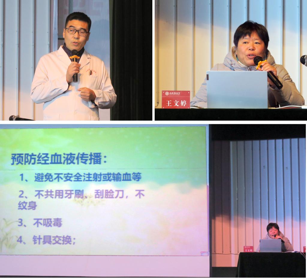 在第33个“世界艾滋病日”来临之际,为了提高我校学生对艾滋病防治的认识,增强自我保护意识,12月1日晚19:30,校医院邀请临汾市疾控中心专家王文婷在德赢vwin体育官网大礼堂举办了以“携手防疫抗艾·共担健康责任”为主题的讲座,校医院副院长赵根锁参加,德赢vwin体育官网500余名师生聆听讲座。讲座由三校区卫生所秦汇丰医生主持。