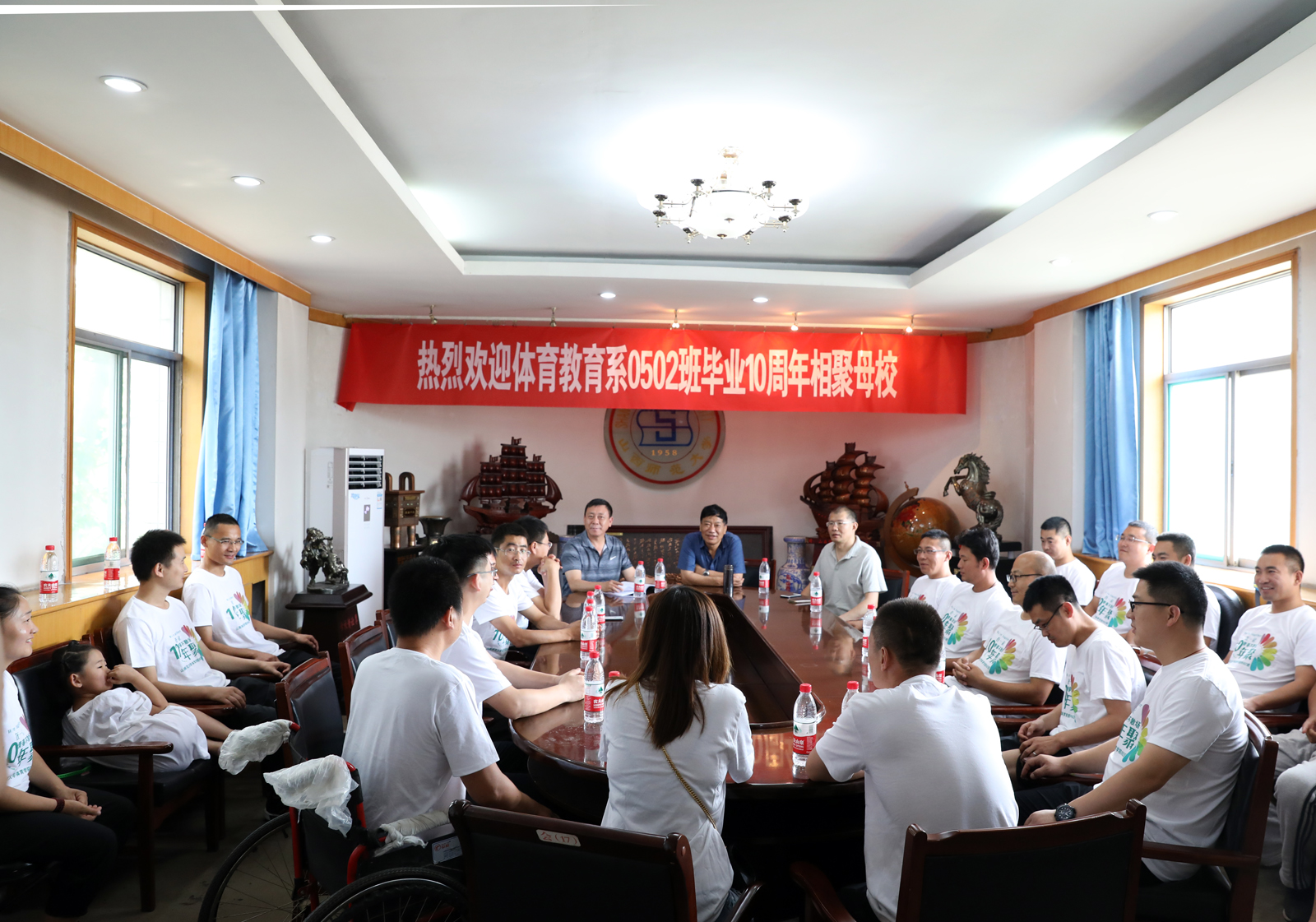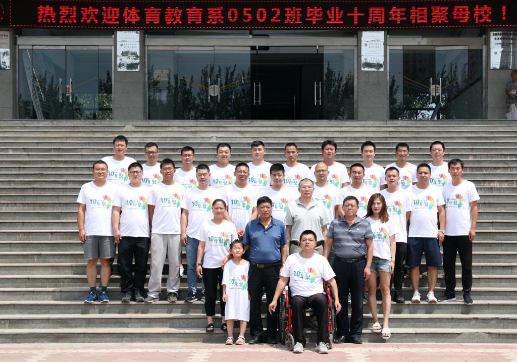 7月14日上午,德赢体育教育系0502班同学毕业十年相聚母校,院党委书记李学刚、院长郑旗、辅导员王泽杰参加座谈会。