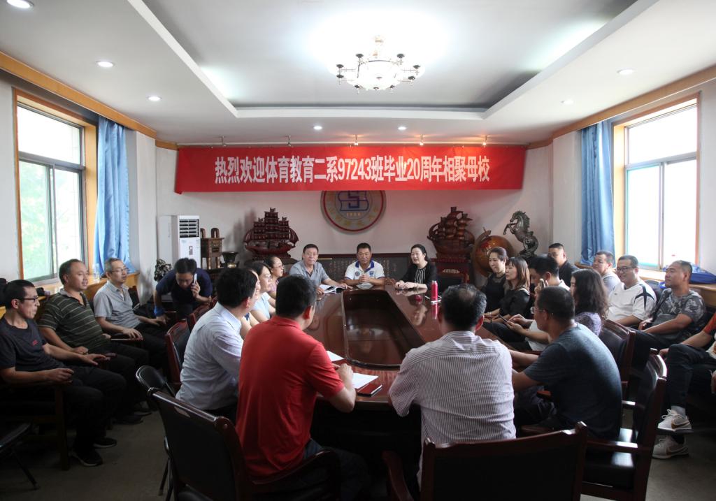 院长郑旗对各位校友毕业20年重返母校表示热烈的欢迎,他向校友简介了学院六十年的发展、专业与学科建设和人才培养、竞赛训练及新校区建设的进展,并对各位校友20年取得的成绩表示由衷的敬意!李吉慧和焦绿青老师对各位校友在工作岗位上取得的成绩给予充分的肯定,希望校友们更多的关注母校的发展。辅导员吴合斌勉励同学们热爱自己的职业,常回母校看看!同学们深情地回顾了20年来个人发展,纷纷表示,感恩师大体院和老师对自己的培养,今后将继续传承“体院人”的精神,为母校的发展壮大尽校友的绵薄之力。