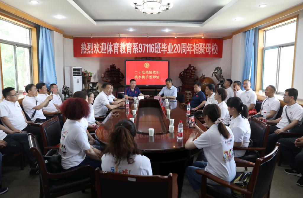 二十沧桑情依旧,桃李携手恩师情。5月29日,德赢体育教育系97116班同学毕业20周年重返母校,重温母校情,共叙同学谊。院党委书记许国宝、院长郑旗、校友会副秘书长杨永茂、97116班辅导员李东蕾、教师代表梁国强等参加校友座谈会。来自山西大学、太原理工大学、中北大学、山西农业大学、山西财经大学、大同大学、运城学院、山西体育职业学院、阳泉师范高等专科学校、长治第二中学、太原市体育运动学校等单位的20余名校友参加了座谈会。同时,校友们怀着激动的心情,参观了校园环境、宿舍、教学楼、食堂、综合馆等场所。